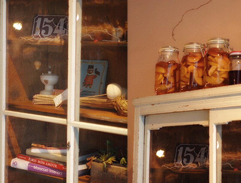 店内を注意深く眺めると、古いキャビネットの中にも小さな紅色の蝶が1羽。同じ棚には中近東ふうのグラスや絵本、観葉植物なども無造作に置かれています。