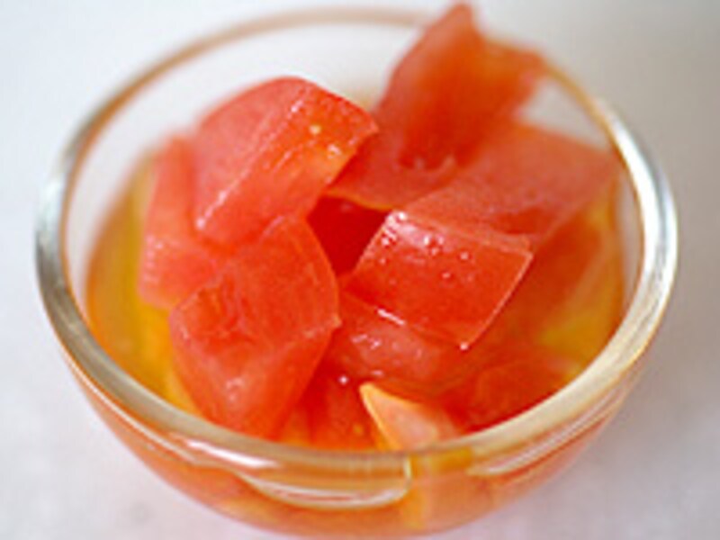 【材料】 トマト …中1個 オリーブオイル(エクストラバージン) …大さじ2 塩 …小さじ1/2 【作り方】 (1) トマトは粗めのみじん切りにしてボウルに入れ、オリーブオイルをまわし入れる。 (2) 軽く塩をふって混ぜ、冷蔵庫で寝かせておく。 ※トーストしたバゲットの上にのせる、サラダにのせるなどさまざまに活用できます。 |