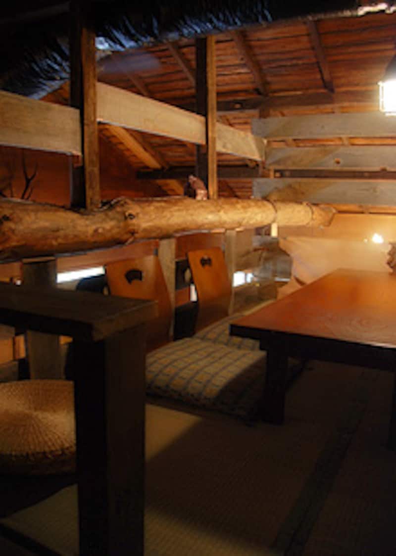 でも、階段をのぼって小さなロフトをのぞいてみれば、そこは畳敷きと座布団の世界(写真左)。この自由さがカフェですよね。座布団に腰を落ちつけると、古い天井を至近距離でつぶさに眺めることができます。