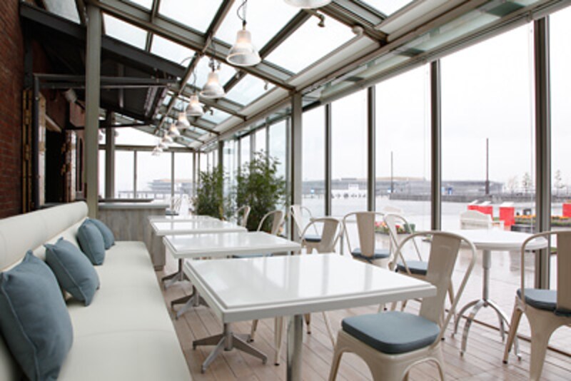 | 開放感溢れるテラス席。この日はあいにくの雨模様でしたが、「銀色の海も美しいよね」とビル。 |