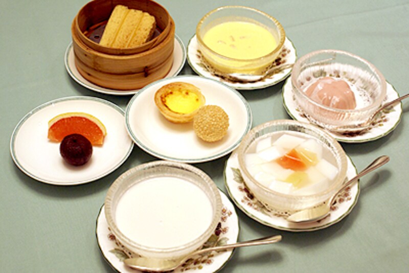 ・杏仁豆腐 ・タピオカ入りココナッツミルク ・フレッシュフルーツ入りプリン ・ナタデココ入りマンゴーミルク ・エッグタルト ・胡麻付き揚げ団子 ・季節のフルーツ ・カスタード入り中国風蒸しカステラ