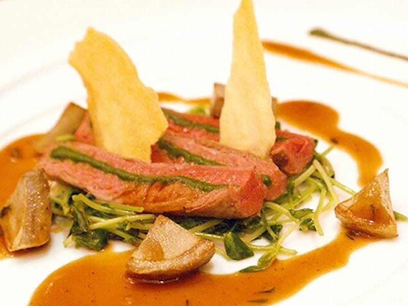 こちらをいただく頃、窓の外はもう真っ暗。時間の経過と共に、料理のテンションも上がってきます。魚料理は、真鯛のポワレ。アラレをまとわせて、カリカリとした食感に。ソースは甘いプルーンとビネガーの甘みと酸味が融合。先に食べた同行者が「シソのような味がする」と言うので、訝しがりながら食べると、確かにどことなくシソのような爽やかな味が。これも「ガニエール」のような分子料理法と言えるでしょう。食感にも味にも驚きがありますが、鯛自体も丁寧に火入れされており、とてもジューシー。