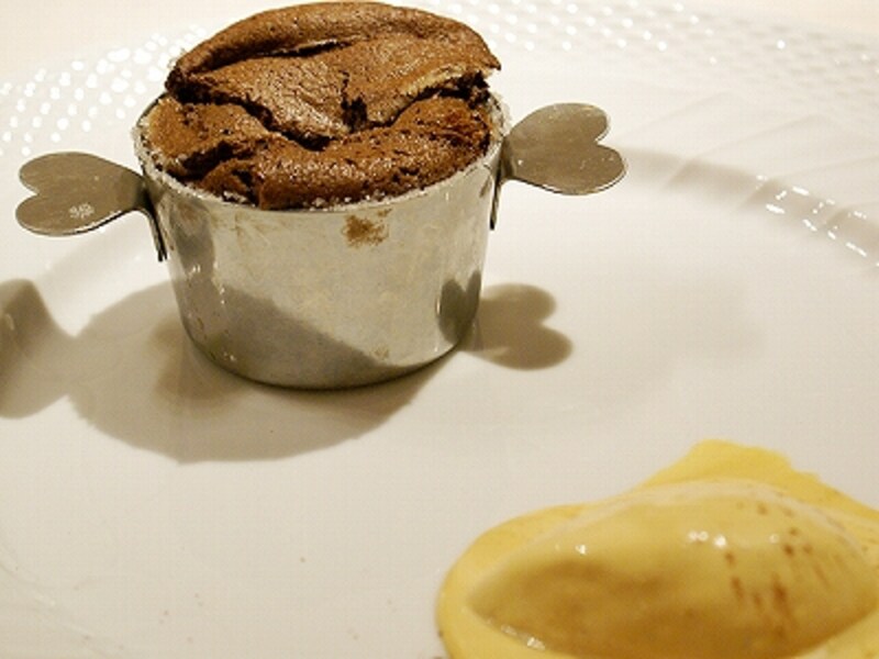 デザートはあたたかいスフレを。濃厚なチョコレートがコースの最後を締めくくり、満足感をいっそう高めます。キャラメルアイスもとても滑らかで、舌の体温ですっと溶けていく爽やかさと、チョコレートにも負けない力強さを持っています。