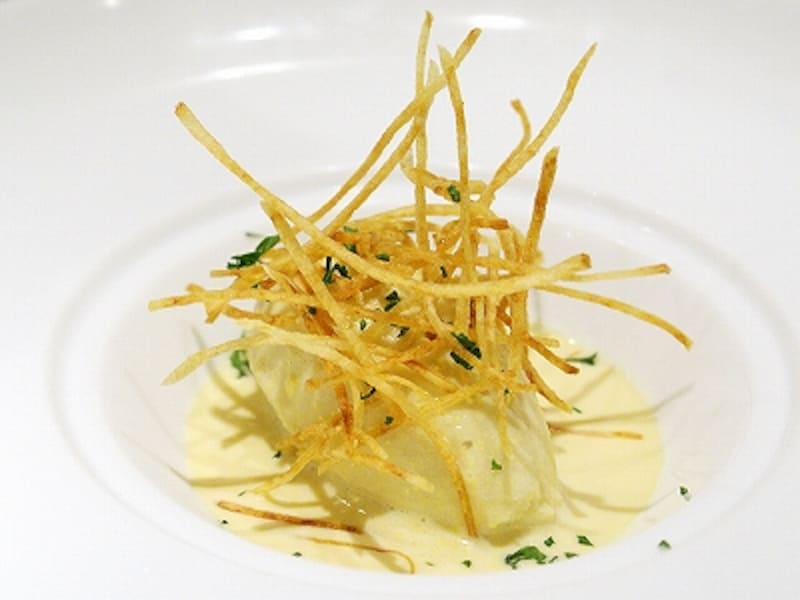 トウモロコシの甘さをいかしたスープの上に、さらにトウモロコシのアイス。アイスにすることによっていったん甘さを抑え、口どけの際に一気に甘みが広がる仕組み。その甘みと細切りポテトの塩気がうまく均衡を保っています。こちらは1ヶ月に2回食べたほど、僕のお気に入り料理でもあります。