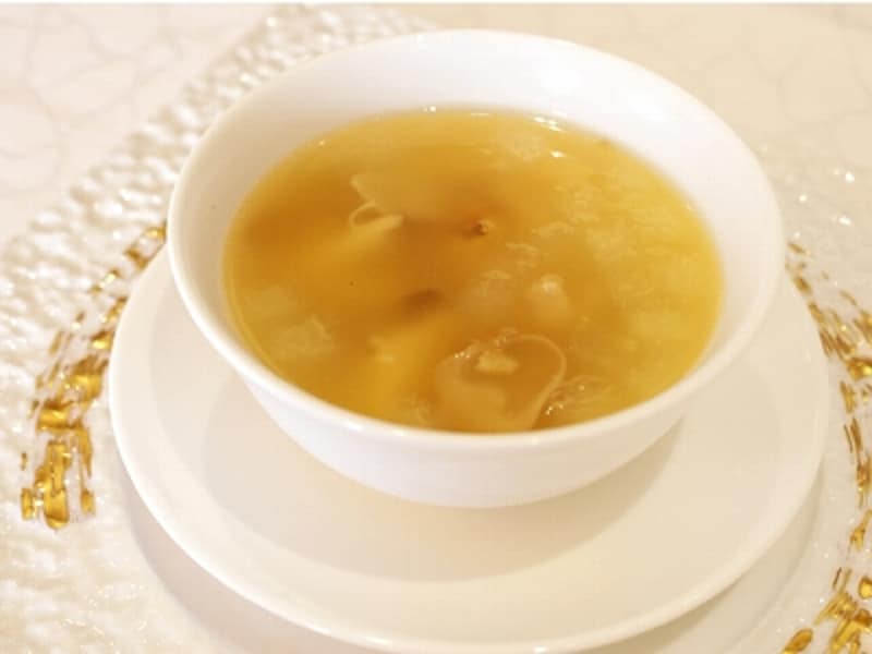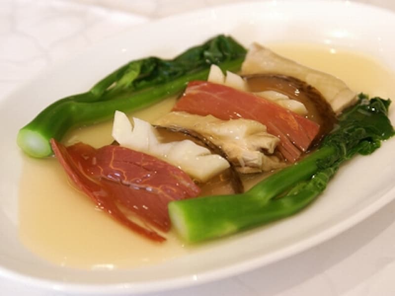 中国・浙江省の金華地区で作られる、世界三大ハムのひとつ、金華ハム。見ての通り、脂肪が少なく肉の旨みが詰まった赤いハムは、上湯など、中華のダシや味付けに欠かせない最高級ハムのひとつ。口に運ぶと、その味わいの深さには驚かされるばかり。塩辛さなど微塵も感じさせないうまみがあります。地鶏と野菜たちもそれぞれ芯のある味を持ちますが、それらをあっさりとまとめ上げる、スープの上品さが一番すごいと思わせる料理です。