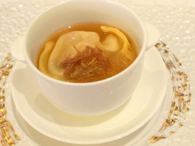 高級中華食材の代名詞とも言えるふかひれを使ったスープに、大きな餃子が浮かんで…というよりは、具の重みたっぷりで沈んでいます。そして、何といっても素晴らしいのは、このスープ。一口でも満足できそうな力強さがありながら、同時に最後まで食べ飽きない上品さを持ち合わせています。