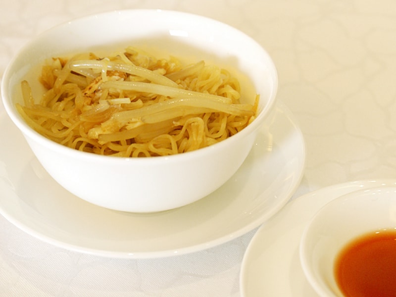 先ほどから「福臨門酒家」と書いていますが、正式には「福臨門魚翅海鮮酒家」といいます。「魚翅」とはフカヒレ。つまり、これと海鮮がこちらのお店の名物料理と言えます。その名物である魚介を、この麺にもたっぷり使い、うまみたっぷりの煮込み麺になっています。さっぱり食べたい方には、添えられた赤酢をつければ、少し強めの酸味が味も気分も引き締めてくれます。