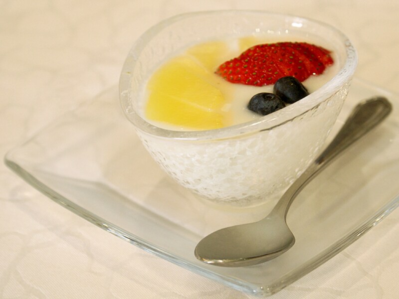 締めのデザートは、数種類から選べます。もちろん、前ページのマンゴープリンもOK。杏仁豆腐はとてもさっぱりとした味で、触れれば壊れてしまうようなデリケートな触感と同様に、味もとても繊細。