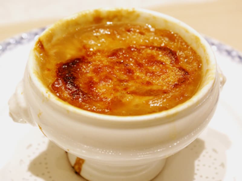 ぐつぐつと煮えたぎったオニオングラタンスープ。ひたすら玉ねぎを炒める、この地道な作業が甘さ、そして甘さに繋がる旨みを生み出します。作る手順としては、けして難しい料理ではないのですが、時間と手間、そして最後の仕上げの味付けなど、やはりプロの料理です。