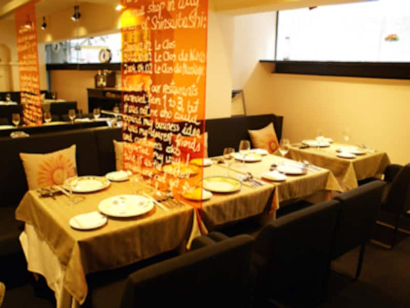 ・2Fはカジュアルに2Fはカジュアルダイニングの18席。オレンジや緑など、暖色系の色でコーディネートされ、フランスのブラッスリーやビストロのよう。テーブルの間はやや狭めですが、それがむしろ賑やかさになっており、ここで食べているお客さんの笑顔がみんな、とても素敵でした。