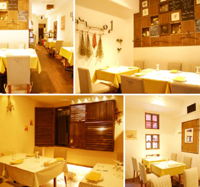 内装はプロヴァンサルプリントのクロスがかけられたテーブルに、座り心地の良い椅子の下には荷物入れのカゴ。黄色をキーカラーとした店内は、寒色系がまったく見当たらず、温かみのある雰囲気があります。また、奥にはビストロには珍しい個室が。グループでの利用もできる、嬉しい配慮です。