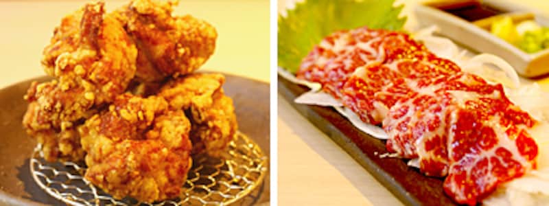 若鶏の唐揚げ(788円)は、「博多秘伝のタレ仕込み」ということで、甘みのきいたタレにコクがあります。熊本直送霜降大トロ馬刺し(1,890円)も押さえておきたい一品です。牛肉などに比べて低カロリーでビタミンやグリコーゲンなども多く含む馬肉は、健康食としても注目されています。しょうが醤油で食べる馬刺しは、クセもなく食べやすいこともあって女性には特におすすめです。