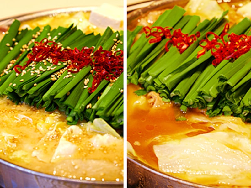 さて、メインのもつ鍋は3種類。白味噌ベースの「白のもつ鍋」(写真左)、醤油風味の「赤のもつ鍋」(写真右)、ポン酢風味の「金のもつ鍋」です(各一人前1,260円・二人前~)。一番人気は、やはり白。昆布と鰹節の出汁に、味噌の甘みがとてもマッチしています。
