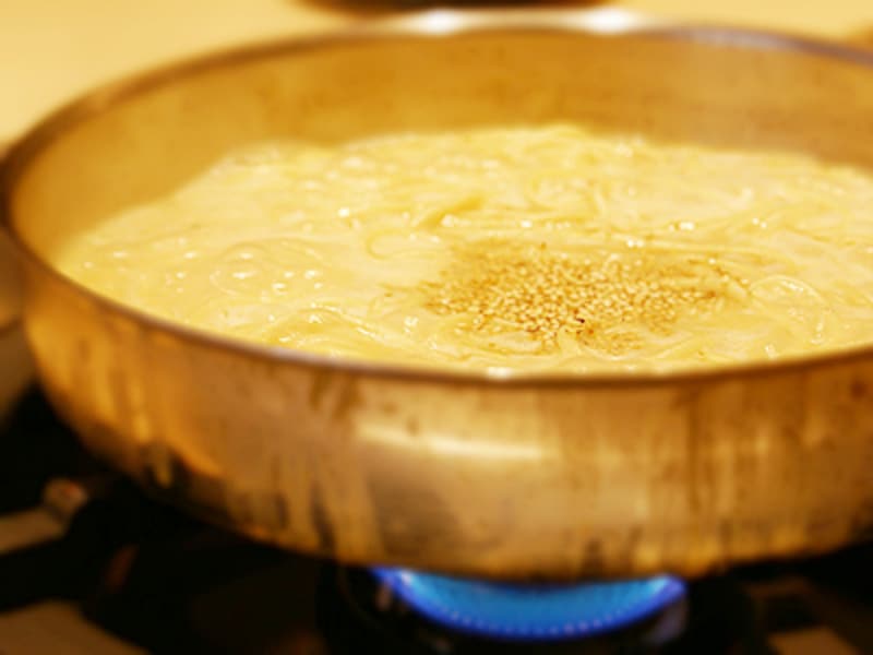 しかし、もつ鍋がおいしいのは中盤から。もつのコクと、野菜の甘みが行き渡ったスープにちゃんぽんを入れると、このスープを吸い込んだ太麺がいっそうおいしくなるのです。白にはちゃんぽん、赤には五島うどん、金には雑炊がおすすめとのことですが、お好みのものを入れるのも良いでしょう。ガイド的には白に雑炊というコンビもボリューム感があって好みでした。
