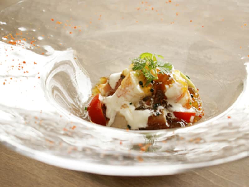 ・前菜:磯香るタルタル オマール海老のジュレ料理の技術の良し悪しがストレートに出るのが、ジュレ(ゼリー)。その点、こちらは間違いなく素晴らしい。素材をいかし、爽やかな苦味が奥深い味を持っています。また、タルタルに使われている具、マグロや帆立など、4種の魚介とキャビア、アボカドのねっとり感がつなぎ、トマトの甘みを加え、少量ながらもたくさんの素材を味わえます。特に、海老の丁寧な加熱は、素晴らしいプリプリ感を生み、この料理のおいしさを際立たせています。