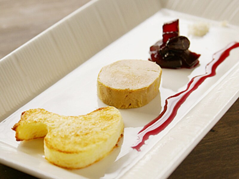 ・フォアグラ料理:フォアグラのトーション ブリオッシュ添えこちらの名物の一つ、フォアグラ料理はコースにも組み込まれています。フォアグラをトーション(布)で巻き、蒸し煮にしたもの。マンゴーやパイナップルなど、フルーツのコンポートと岩塩、そしてブリオッシュを添えるという、オーソドックスなスタイルで。この一皿のためだけにもワインをオーダーしたくなるような、しっかりした味付け。幸い、グラスワインの種類も充実していますので、共にいただくのがオススメです。
