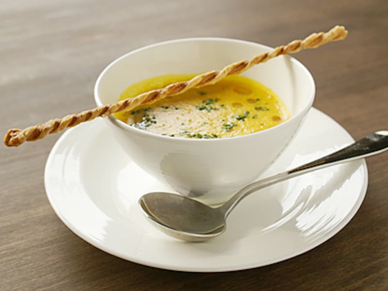 ・カボチャのポタージュ バニラの香りかぼちゃの甘みがしっかりで舌も満足、とろみもあるのでお腹も満足できるスープです。ちなみに、スープはアラカルトでも3種類用意されています。コンパクトなお店にも関らず、これだけ用意されていることに、レストラン出身ならではの矜持を感じさせてくれます。