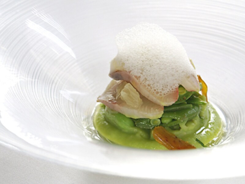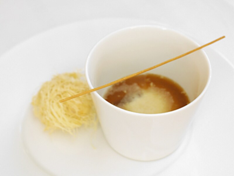プレゼンテーションもさることながら、白子の下処理など、基本的な部分もしっかりされており、独特の臭みもまったくありません。ぷにゅっとした食感のをカダイフ(極細のパスタ)で巻いて揚げることで、ぱりっとした食感のコントラストを生みます。茶碗蒸しのような、ふわりとした食感のフランとのコンビが面白い、白子のデギュスタシオン料理です。