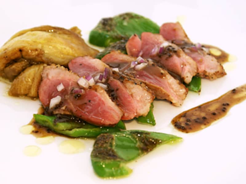・ヴァンデ産鴨胸肉のロースト 板持産焼き茄子添えシンプルに仕上げられた、艶のある鴨肉。火入れはややレアめで、魚の火入れといい、シェフの料理への考え方が明確に表れています。シンプルで食べ応えのある料理。シェリービネガーの酸味に粒マスタードとレーズンを合わせたソースも主張しすぎず、この料理の主眼が鴨にあることに徹しています。