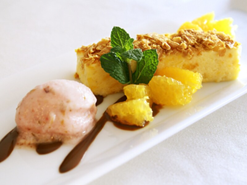 ・ポンカンのシブースト 桜のソルベとフレッシュの柑橘フルーツを添えてこちらのマネージャーを務める山口氏はフレンチをされていたこともあるそうで、イタリアンといえどもデザートは楽しみの持てるものを、とシェフと相談されているそうです。この日はシブースト。イタリアンで見ることはあまりないデザートで、ふんわりとした甘みのクリームに寄り添うように、フルーツが柔らかな甘みをもたらします。