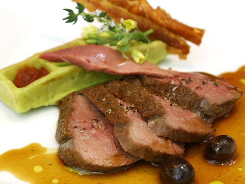 メインにはシャラン産鴨肉を。鴨がしっとりと焼かれ、肉を食べるというフランス料理の醍醐味をちゃんと味わえるのは、もはや言うまでもないでしょう。ここで注目したいのが付け合せ。緑の器の中に入っているのはベーコンクリーム、グリーンピースのピュレ、トマトのコンフィ。途中で味を変えて楽しめるのですが、この器となっているのがワッフルなのです。ちょっとした遊び心。秋吉シェフの料理には、いつもこういった「仕掛け」が見え隠れします。突飛なものではないけれど、変わった趣向を。その一手が、料理に奥深さを持たせ、僕がこの先もこの人の料理を食べ続けたい、と思う理由でもあります。