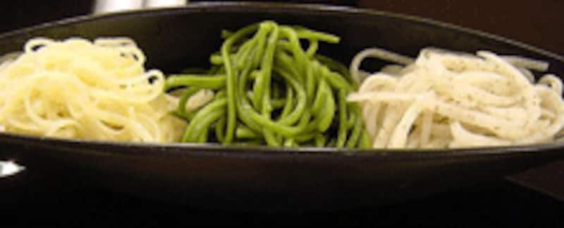 ちなみに、三色もりにしたのは、一番左が0.8mm正角の柚子切り、真ん中が1.6mmに延して1.4mmで切った切りべらの茶そば、右が、1.3mm厚1.8mm幅の芥子切りである。