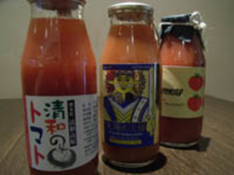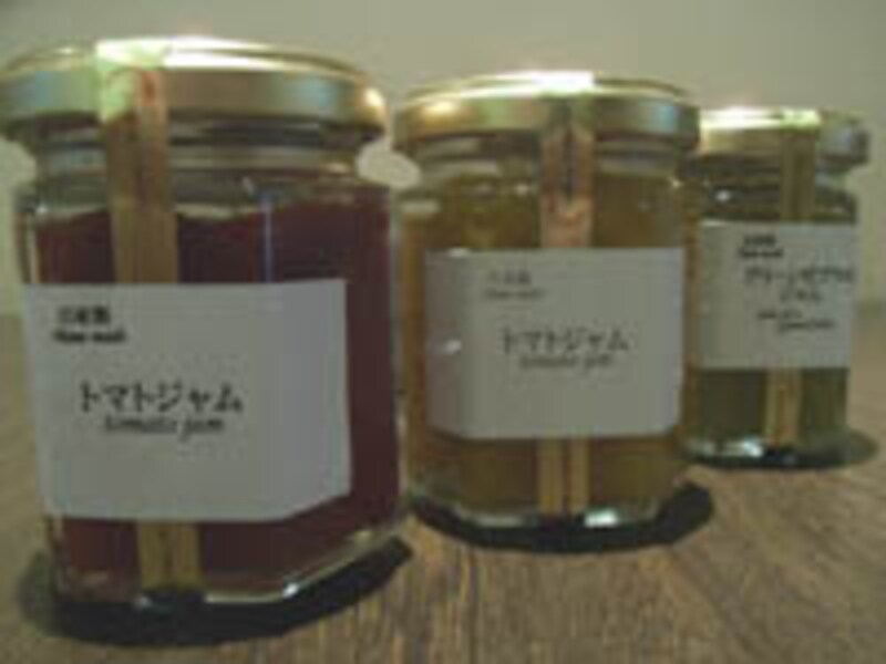 | 自家製のトマトジャム各1000円 | こだわりのトマトジュース手前から300円・700円・1000円 |