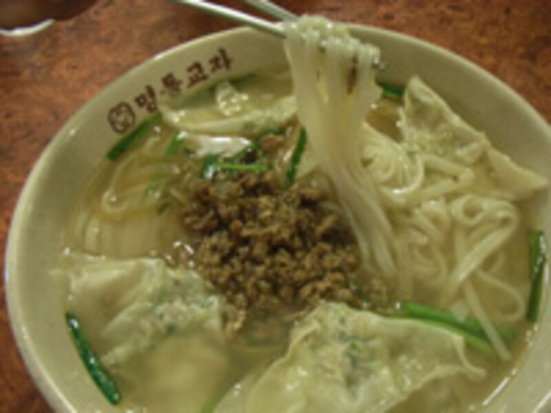 ソウルいちの繁華街、明洞の名物となっているのが、明洞餃子(ミョンドンキョジャ)。お昼時には長い行列ができています。みなさんのお目当てはマンドゥと呼ばれる蒸し餃子とカルグッスという鶏ガラスープの平麺手打ちうどん。マンドゥはニンニクがこれでもかっ!ときいたパンチのある味わい。噛むと肉汁と一緒にニンニクの風味が口の中ではじけるよう。また、カルグッスはコクのあるスープにきしめんを思わせるのどごしの良い麺を合わせています。夏季限定メニューのコングッスとよばれる豆乳スープの麺もさっぱりした美味しさでスルスルと喉を通ります。無料サービスされるニンニクがガツンときいたキムチも一食の価値ありです。![]() | ![]() | ![]() |