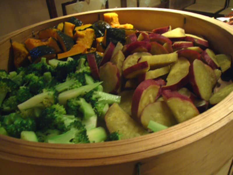 大きなセイロで蒸されているのは、さつまいもとカボチャとブロッコリー。蒸しただけでこんなにも甘さや香りが強く感じられるのは、野菜が大切に育てられ、元気だからそこ。もちろんそのままでも美味しいですが、お好みで明太子やバジルを加えたマヨネーズソースを付けていただきます。
