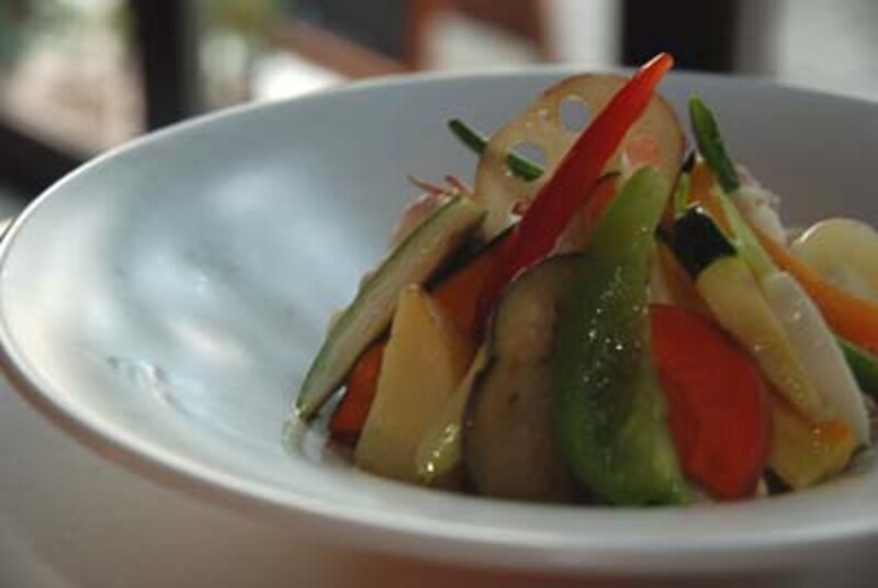 そのカレーと合わせるのは、一度素揚げして色鮮やかになった旬の野菜たち。油と合わせることで野菜の味や香りが凝縮し、栄養面でもカロテンが体に吸収されやすくなるのです。たっぷりの野菜で見えませんが、ご飯は