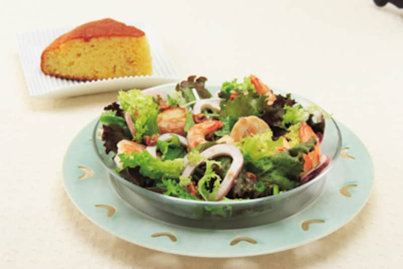 海の幸のサラダ (950円)。 有機水菜、有機ルッコラなどの野菜に3種のシーフードをたっぷりとトッピング。特製のクルミドレッシングの味わいも絶品です。