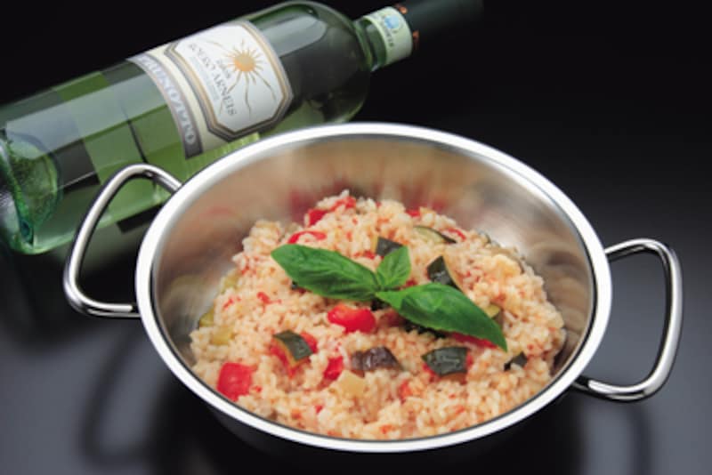 カポナータリゾット (1,050円)。ガーリックや唐辛子を使わず、トマトの甘さと酸味が引き立った優しい味わい。アルデンテに仕上げられた米の食感もたまりません。