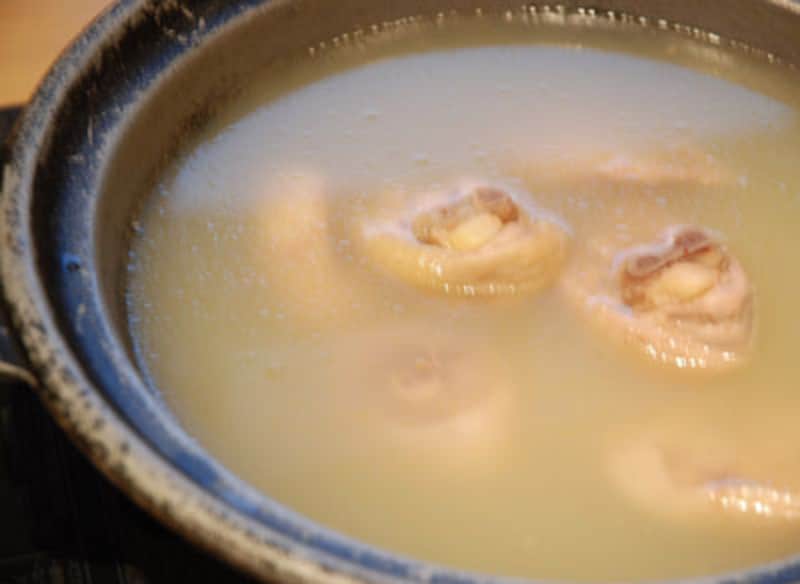 上記のコラーゲンを鍋に移して火を入れると、みるみるうちに溶け出しスープ状に。まずは、一口飲んでみて下さい。スープは驚くほどさっぱりとした味わいにもかかわらず、深いコクや旨味はもちろん、舌を包み込むようなまったり感。鶏肉特有の臭みは少しもありません。エキスを凝縮した、純な味わいを楽しめます。![]() |
