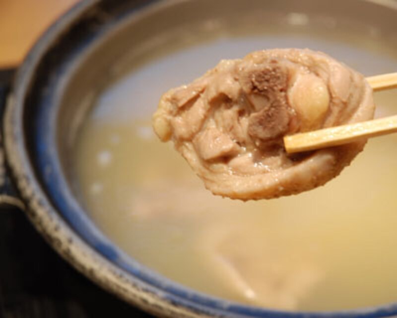 博多華味鳥は、水炊きの本場博多から銀座へやってきたお店です。夜は高級店として知られていますが、昼は比較的リーズナブルにいただけるのが嬉しいところ。右の写真を見て下さい。こちらが、水炊きに使われるスープ。鶏ガラを5時間も煮だして作ったもの。コラーゲンをたっぷりと含んだスープは冷えるとゼリーのように固まります。今回はじっくり堪能できる水炊きコースと、手軽に楽しめるお膳を紹介します。