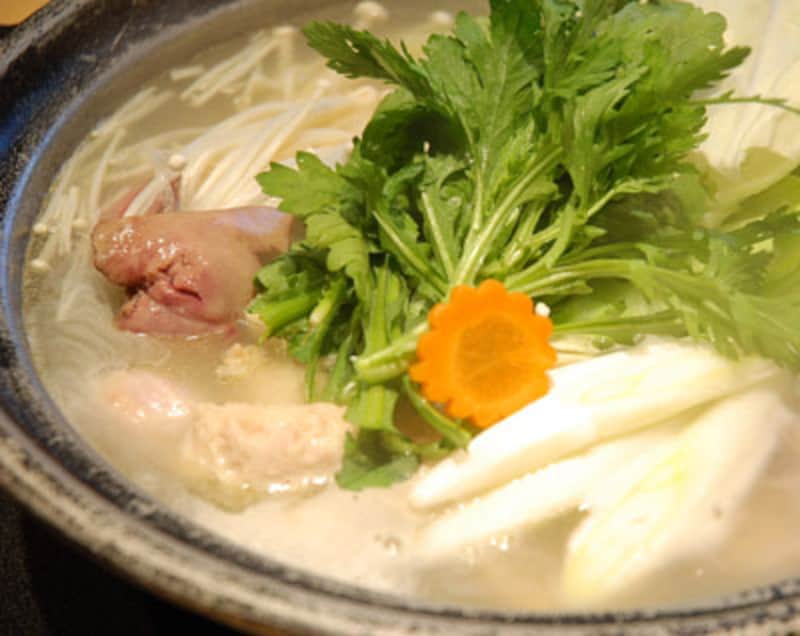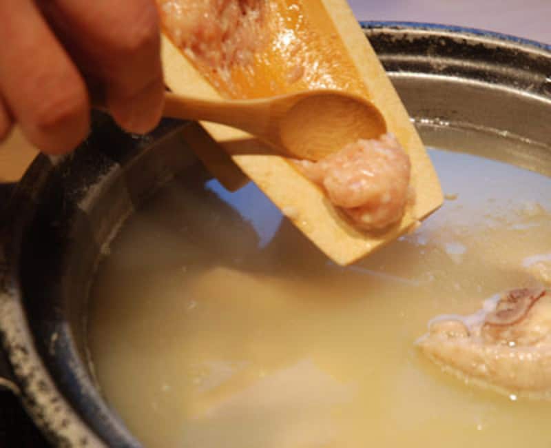 鶏鍋の具で忘れてはならないのが、つくねです。こちらのつくねは目の覚めるような美味しさでした。鶏の首の肉だけを使い細かく挽いたもの。鍋の中で火を通すと、旨味をたっぷりと含みながら、口のなかでサラリととけるジューシーな脂が噛み締めるたびにあふれてきます。![]() |