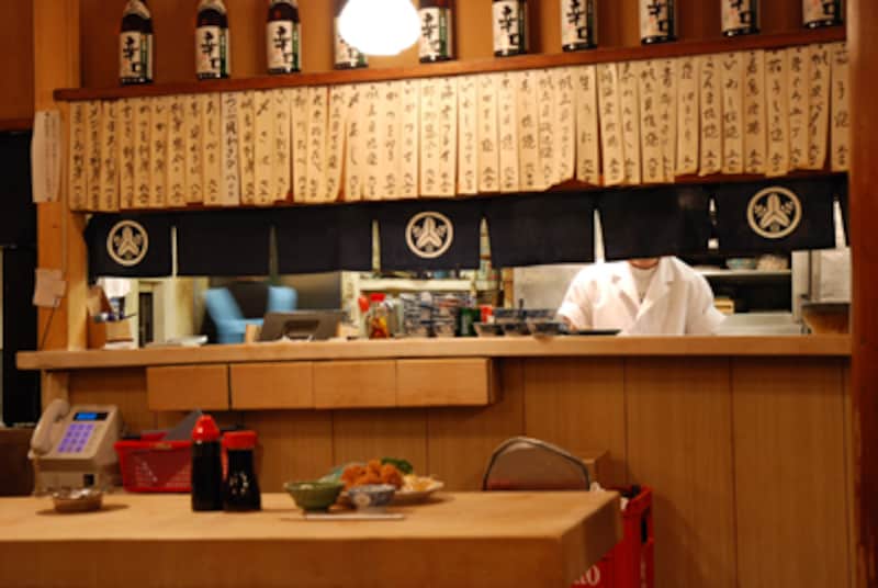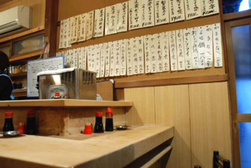 ガラリと扉をあけると、まず目に飛び込んで来るのは壁に所狭しと貼られた手書きのお品書き。「ぶりあら煮」「ヤリイカ一夜干し」「あん肝」など、そそられる一品料理が目白押し。こちらは11時半から夜までの通し営業なので、まだ早い時間からお銚子をかたむけるお父さん方も多くいらっしゃいます。その雰囲気に後押しされてつい「熱燗一本!」と注文したくなってしまうのもこのお店ならでは。