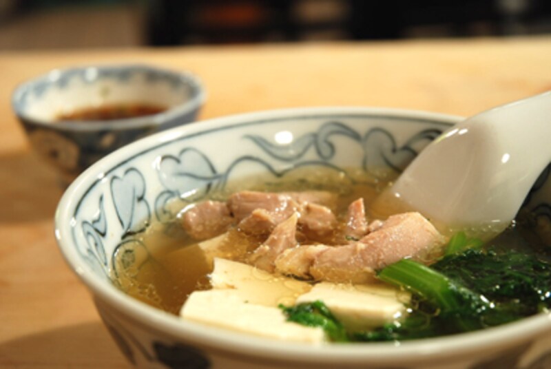 鳥豆腐がつくからです。鳥の旨味がたっぷりのスープに春菊と豆腐を浮かべたシンプルな一品。スープはクリアでコクがあるのにすっきりとした味わい。春菊のほろ苦さがキリリと舌を引締めます。お好みで特製ポン酢をつけて召し上がれ。体があたたまり、冬場は特に嬉しいメニューです。ちなみに、相席のお隣さんは定食のお供に焼酎のお湯割。でも分かるなあ……その気持ち。