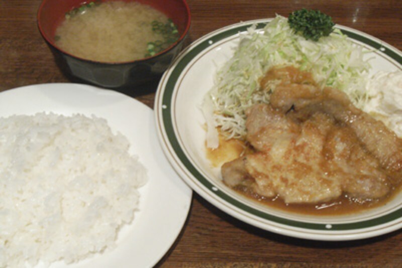 ポークジンジャー定食が出てきました。前ページのキッチンマカベと同じく、厚切りタイプ。これでお値段920円というからかなりお得です! さっそくひと口食べてみると、まず感じるのは、生姜のピリッとした辛味と爽やかな香り。いやが上にもご飯がすすみます。タレは秘伝のステーキソース。味醂の甘みは抑えめで醤油をきりっときかせた味わい。