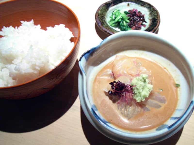 銀座の喧騒からちょっと外れた東銀座にうち山はあります。こちらのランチでいただける鯛茶漬けが必食! カウンター席に着くと、ご主人が立派な鯛をさばいていました。ランチに出す食材にも一切の妥協がありません。こちらは個室もありますが、少人数でしたら、ぜひカウンターがおすすめ。華麗な包丁さばきを見ながら食事をするのも楽しいものです。![]() | ![]() |