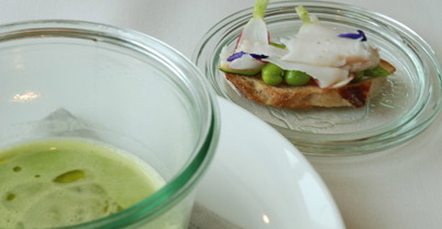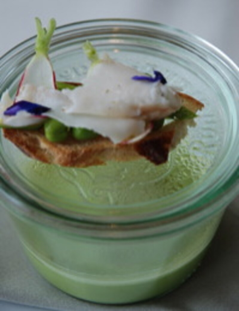 グリーンピースのヴルーテ 旬野菜とコロナータ産ラードのトースト。まずはヴルーテを一口。「グリーンピースってこんなに甘いんだ!」驚くほどの自然な甘さなのです。しかも、青々とした香りがダイレクトに感じられます。味に微かにアクセントを加えているのは、黒オリーブのピューレ。ほのかな塩気が全体の味を引締めています。ヴルーテとはフランス語で「ビロードのようになめらか」という意味。丹念に濾しているからこそ生まれる舌触りです。一緒にいただいたトーストは野菜の食感がリズミカル。ラードというよりは生ハムの脂身のようにしっかりした塩分が染み込み、トーストと野菜とをうまくつなぎ合わせてくれています。