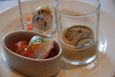 中でも私が気に入ったのは、上写真の右側にある、椎茸のコンソメロワイヤル。コンソメの深い旨味と椎茸の香りがよく合っています。さしずめ、洋風冷製茶碗蒸しといった趣きでしょうか。
