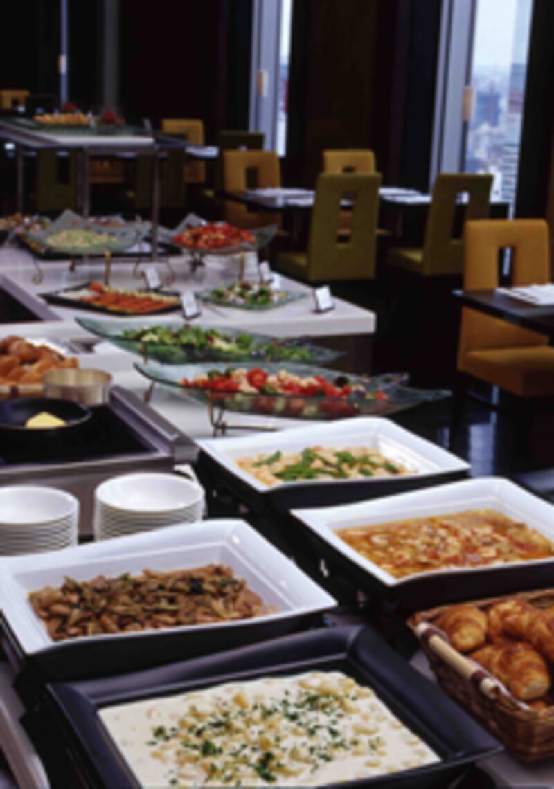 レストランがオープンする午前11時30分。レストランの前には、多くの女性であふれいました。予約しておいてよかったー。実は以前、予約をしないで訪れ、席がとれなかった苦い経験があったのです。名前を呼ばれ、一組ごとに席へとご案内。24階にあるレストランの窓からは、眺めのよい景色が楽しめます……が、気になるのは料理が並んだビュッフェ台。はやくも「花より団子」状態になってしまいました。