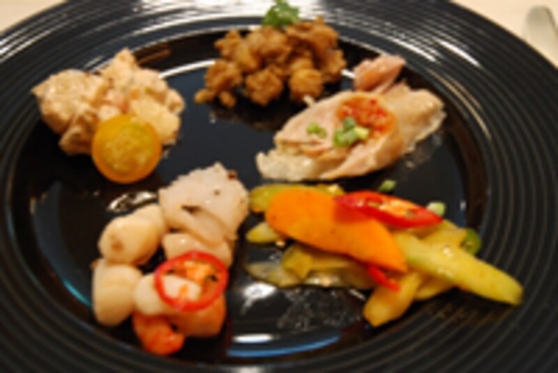 レストランに入ると、ビュッフェ台にずらりと並ぶ料理の数々。前菜からメイン、デザートまで約60種類もの料理がお客を待ち受けています。まずは前菜から。