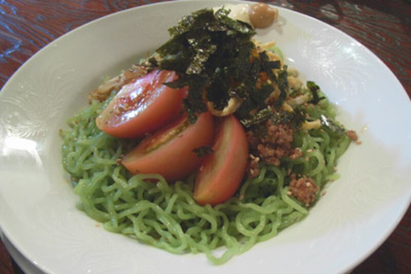 冷やし麺(930円)。アボカド麺と同じく、クロレラ入りの麺に合わせるタレはゴマ風味で甘辛い味わい。酢はおさえてあり、酸味が苦手な方にもうってつけ。具はシンプルにトマトや薄焼き玉子などで、麺とタレのコラボレーションを実感できるのが特徴です。最後に振りかけられたもみ海苔が、香りのアクセントになっています。