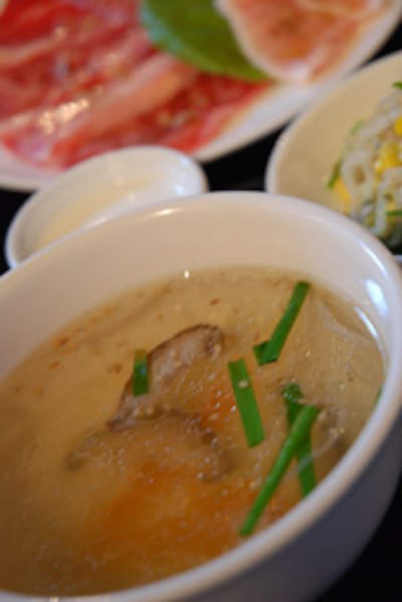ムチムチとした弾力のある豚トロや、脂のほとばしるカルビの旨さに唖然としているところへ、さらなる美味しさの波が打ち寄せてきました。それは添えられたスープ。何気なく飲んで、その味わいの深さにびっくり! 濁りのないクリアなスープからは想像もできないほど、コクや旨味が複雑に混ざり合っているのです。牛テールを大鍋に隙間なく詰め込み、沸騰する直前の温度を保ちながら長時間かけて煮だしたもの。アクは丹念に取り除き、純粋で上品な旨味だけを抽出。高級フレンチレストランでいただくコンソメスープに勝るとも劣らない、奥行きのある味わいなのです。