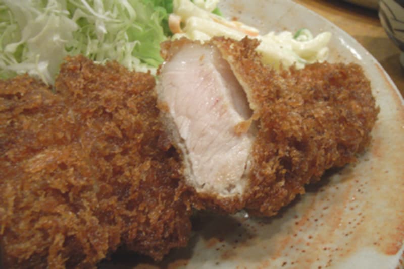 ロースの中心は透明な肉汁をたたえ、火の通し具合に職人の技を感じます。まずは、何もつけずに一切れ。濃厚な豚肉の味が口の中で膨らみ、衣の香ばしさがあとをひく味わい。そして忘れてはならないのが脂身の美味しさです。噛み締めると旨味をたっぷり含んだ脂がジワリとにじみ出てきます。これぞロースカツの醍醐味!