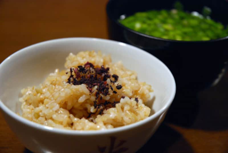 正直なところ、「メインが豆腐だとちょっとご飯がすすまない?」と思っていたのです。この玄米ご飯を食べるまで! 実は玄米ご飯はそれほど好んで食べるものではありませんでした。あのボソボソ感がちょっと苦手……。しかし、浸水時間を調節し蒸し上げることで、もっちりとしていて瑞々しい食感に仕上がっています。独特の香ばしさもたっぷり。さらに舌を喜ばせてくれるのは、振りかけられたゆかりです。カリカリ梅のみじん切りを加えてあり、梅の酸味と塩味でご飯がどんどんすすみます。たっぷりのカツオ節でダシを取り、ニラを浮かべた味噌汁と、このご飯だけでご馳走!