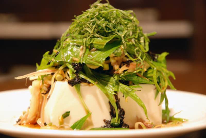 薬味たっぷりお豆腐定食(1000円)をお願いしました。定食には肉料理(※取材日は若鶏の唐揚げ葱ソース1200円)や魚料理(※取材日は初鰹と新玉玉ねぎの和風カルパッチョ1300円)もありますが、ここはあえてシンプルなものをチョイス。