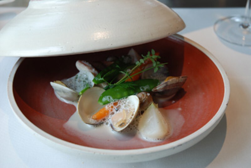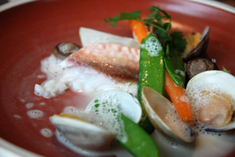 白×赤のコントラストが鮮やかふた皿目は、ホタテ貝のタルタル。白とソースの赤のコントラストがとてもきれい。このソースはトマトのガスパチョ。メロンも加えて甘さと爽やかな香りが印象的です。ホタテのまったり感を引締めるのはライムの果汁。添えられた生のアーティチョークの食感がリズミカルに響きます。ピノ・デ・シャラントの香りがアクセント先程も書きましたが、ラ・ロシェルは港街。そのせいか魚介の料理が続きます。次の料理はホウボウのショードレ(魚のスープ)。ふっくらと蒸し焼きされたホウボウに魚介の旨味を凝縮したソースが絡まります。スタンダードな魚料理ですが、ピノ・デ・シャラントの甘いブドウの香りが味に広がりを持たせてくれていました。食べるごとに次の料理が待ち遠しくなる。そんな魅力を持っています。次はどんな料理が飛び出してくるのでしょうか?前のページへ123次のページへ