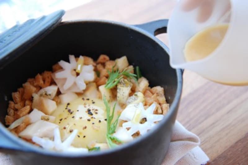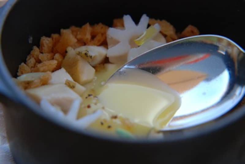ベージュ アラン・デュカス 東京の味をそのままにまず運ばれてきたのは、ガスパチョスープとサラダ。夏らしくシェリーの酸味が爽やかに舌と胃を刺激します。メインはトキワ養鶏のこだわり卵”こめたま”ココット仕立て さまざま貝、レモン風味。たっぷりのバターで揚げるように焼いたクルトンにツブ貝、花の型に切り込みを入れたイカをあしらっています。中央に浮かんでいるのは玉子。米を主体の飼料として育てられた鶏の卵は淡い色合いで、独特の臭みが全くありません! まるで舌の上をさらりと流れるような味なのです。全てをまとめあげるのは、白ワインのソース。バターの風味と貝の旨味が、クルトンと玉子をうまくつなぎます。つぶ貝のムチムチ感、クルトンのカリカリ感が口の中でリズミカルに響く心地よさ。計算されつくした、味覚の重なり合いはさすがのひと言です。さらに無農薬ハーブを使ったハーブティもつきます。鮮烈なハーブの香りに目が覚めるよう。味だけでなく、心も体もリラックスできるとびっきりのランチタイムを過ごすことができました。さあ、次のページではアフタヌーンティーセットをご紹介します!前のページへ123次のページへ